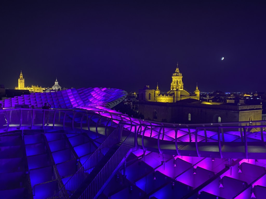 - Las Setas, une structure en forme de champignons qui sert de point de vue avec passerelle. Se visite de jour comme de nuit, avec une préférence pour la nuit car le site propose un spectacle sons et lumières et permet d’avoir une belle vue sur la ville illuminée de Séville.