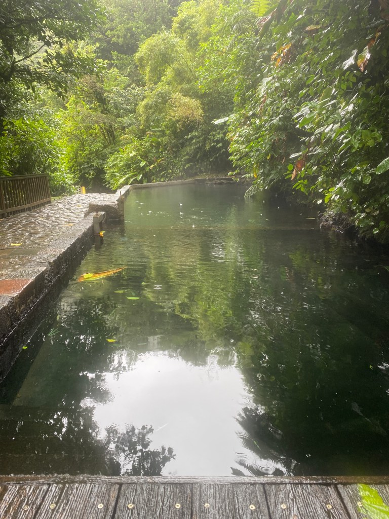 Difficulté : Moyenne - Les Bains-jaunes, le point de départ de la Souffrière. L’eau chaude naturelle (30°) et la végétation environnante offre une halte décontractante après la randonnée.