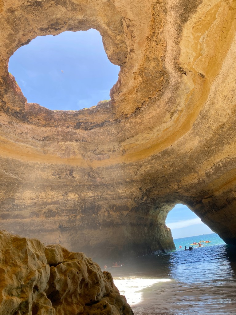 La vue d’en dessous : Elle est accessible uniquement en bateau ou kayak. Nous avons opté pour l’activité kayak qui dure 1h30 pour un coût de 28,5€ pour deux. Nous avons eu le temps d’aller dans la grotte et pagayer jusqu’à la Praia da Marinha et voir le double arche vu d’en dessous, c’est incroyable ! Sur le site https://www.getyourguide.fr, nous avons directement pris nos billets en ligne et avons retrouvé le loueur sur le parking cité au dessus.