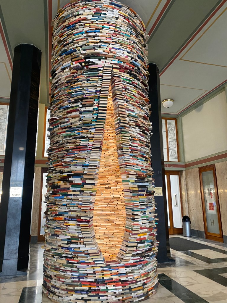 - Bibliothèque municipale de Prague, surtout connue pour sa célèbre pile de livres. Pour l’expérience, passez votre tête à l’intérieur de cette tour et vous aurez l’impression que celle-ci est infinie. Petite attraction sympathique et gratuite mais attendez-vous à faire la queue pour pouvoir la photographier, sauf si vous arrivez à l’ouverture.